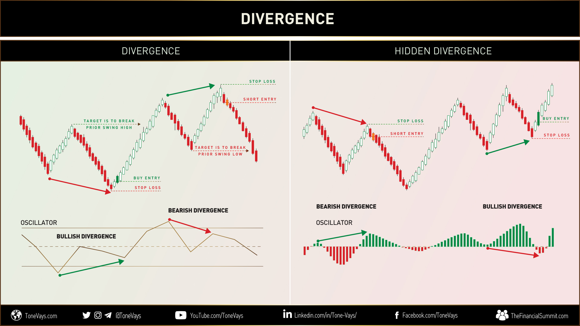 Before we move to the introduction of Oscillators we should discuss one important concept known as Divergence. Many of the Oscillators in the next section provide their own internal signals but in addition to that, most are also used as Leading Indicators when Divergence is identified. This can take place even when the indicator is of the Lagging variety. You may want to come back to these additional resources here, here and here, after becoming more familiar with the Oscillators in the next section so it is much clearer on what is being referenced. In addition to Divergence, there is a concept of Hidden Divergence. Personally I am not a huge fan of trusting Hidden Divergence but feel free to read more about it here.